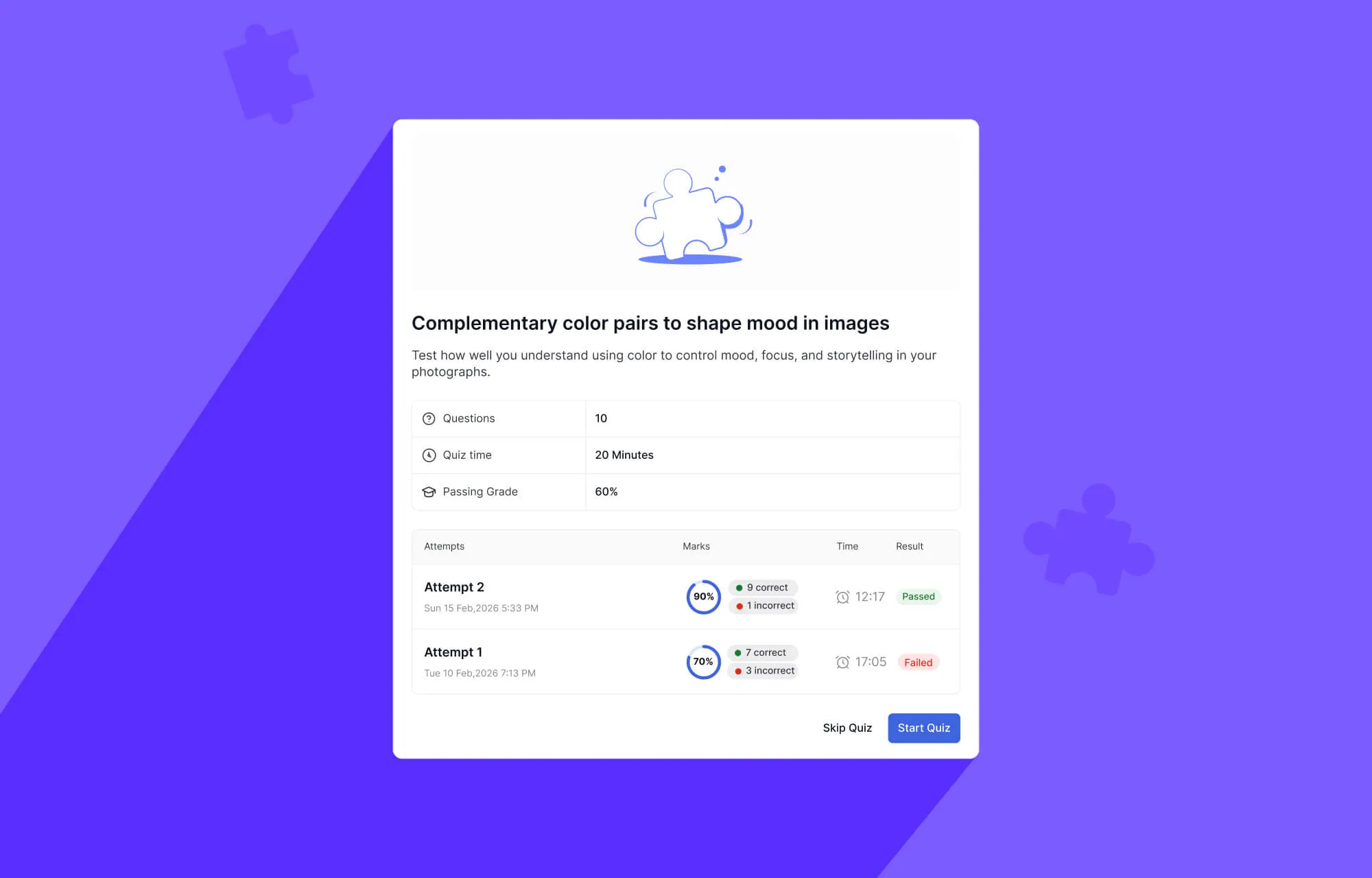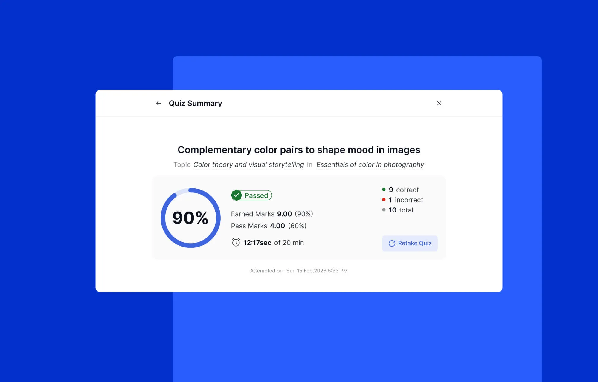 Students can also review a comprehensive quiz summary and results for every attempt, and retake quizzes if that option is enabled.