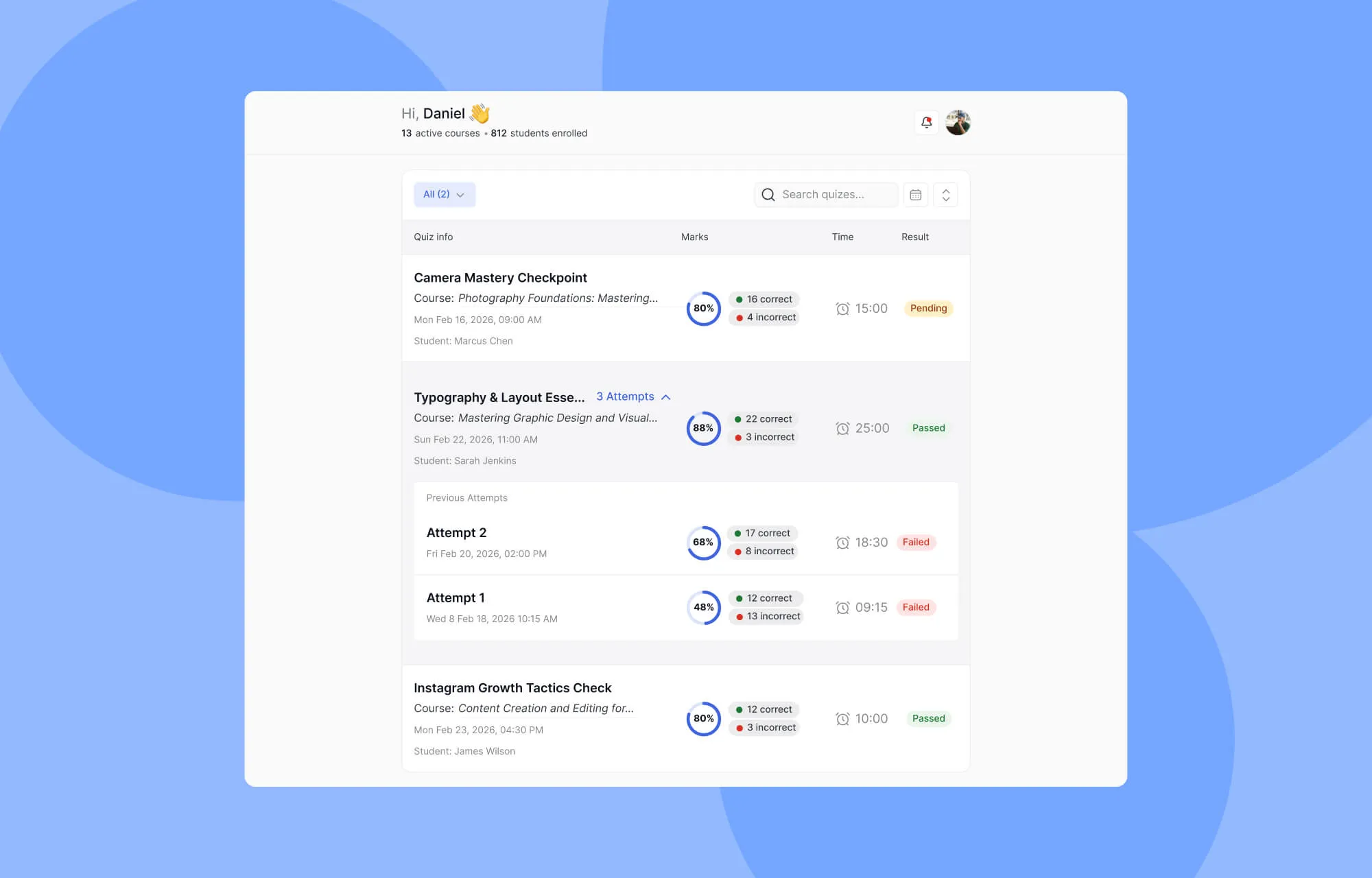 Student quiz attempts, assignment submissions, and course-wise announcements are now easier to access and manage without jumping between multiple sections. This centralized approach saves time and helps instructors respond to learners more efficiently.