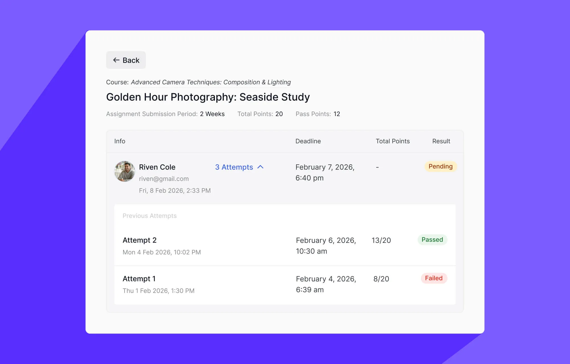 - Track Attempts: All submission attempts are visible to the learner.