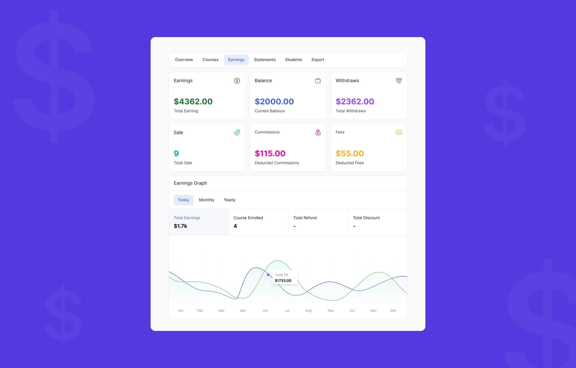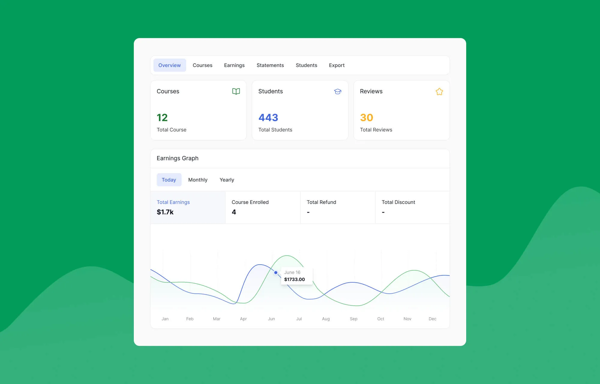From a single, unified dashboard, instructors can get a complete bird’s-eye view of their academy. At a glance, they can see their earnings over time, active and top-performing courses, recent activity, student reviews, and more.Â