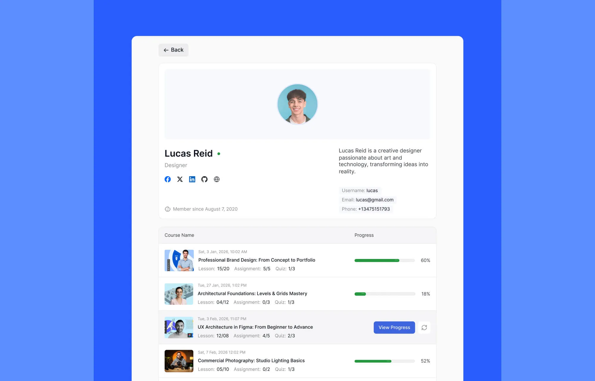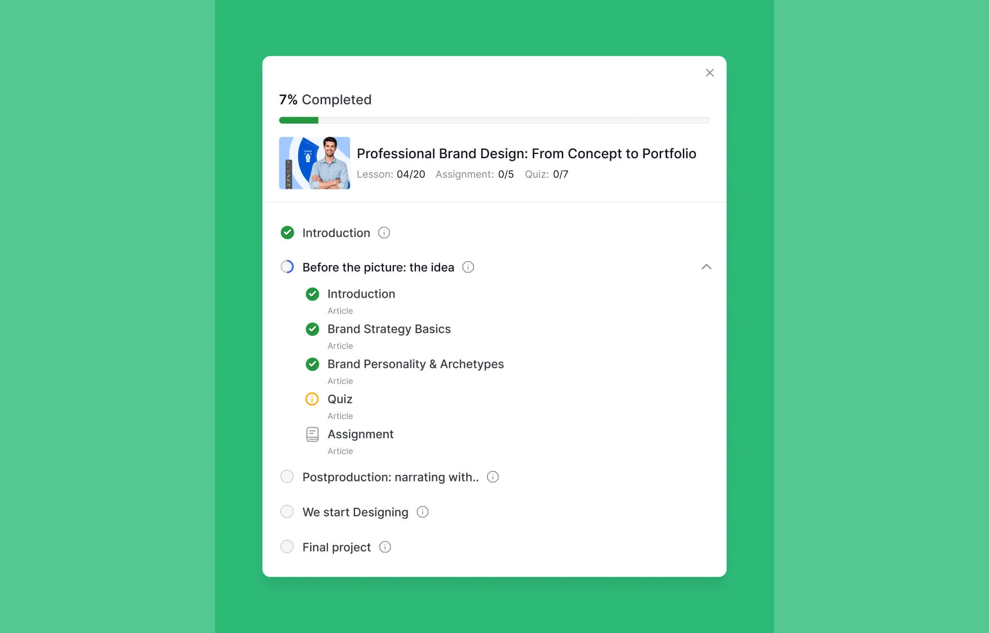 - Curriculum, progress, and duration remain visible at all times.