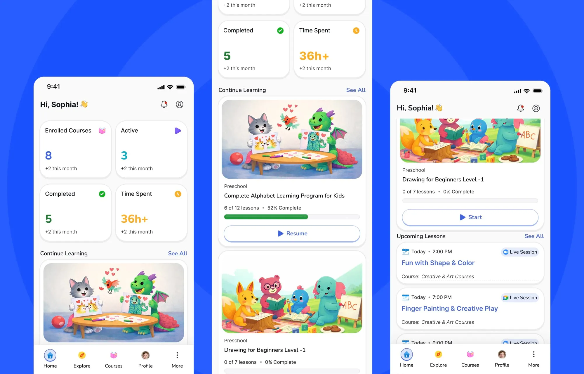 The new Dashboard acts as a true command center for a learner’s education. Instead of navigating through multiple sections to understand their progress, students can instantly view live lessons, total time spent learning, and upcoming tasks, all at a glance.