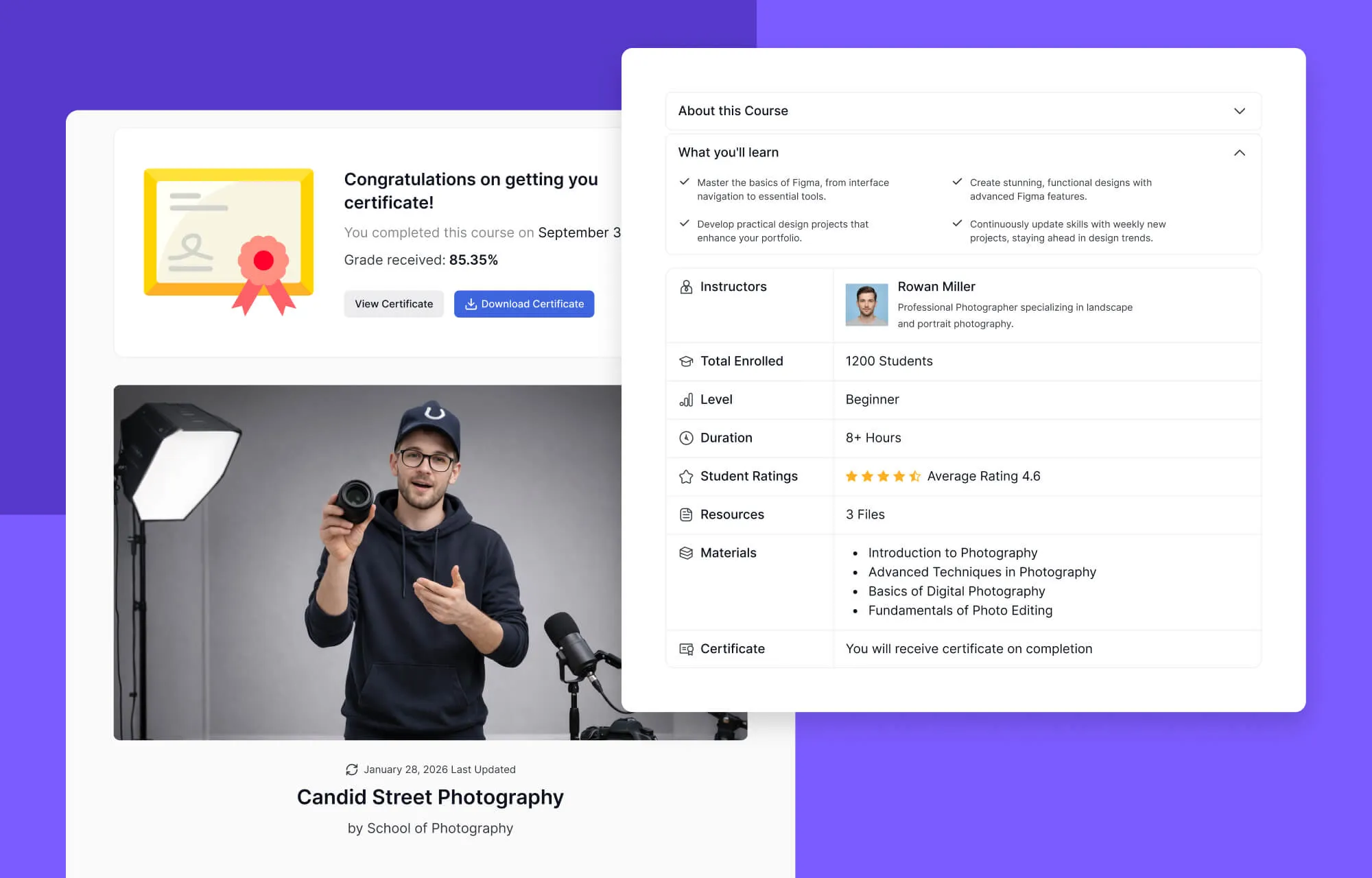 As lessons are completed and quizzes are passed, the progress tracker dynamically fills. The moment the final requirement is met, the certificate is generated with a celebratory animation.Â