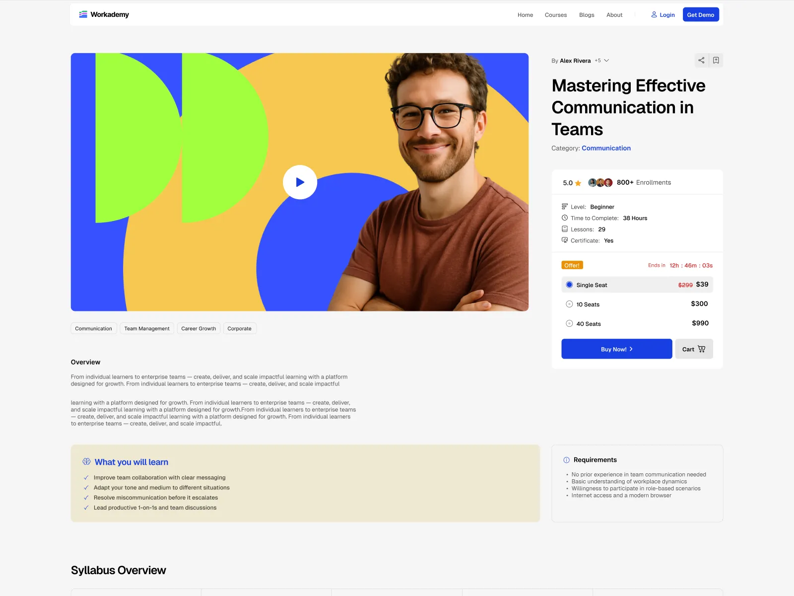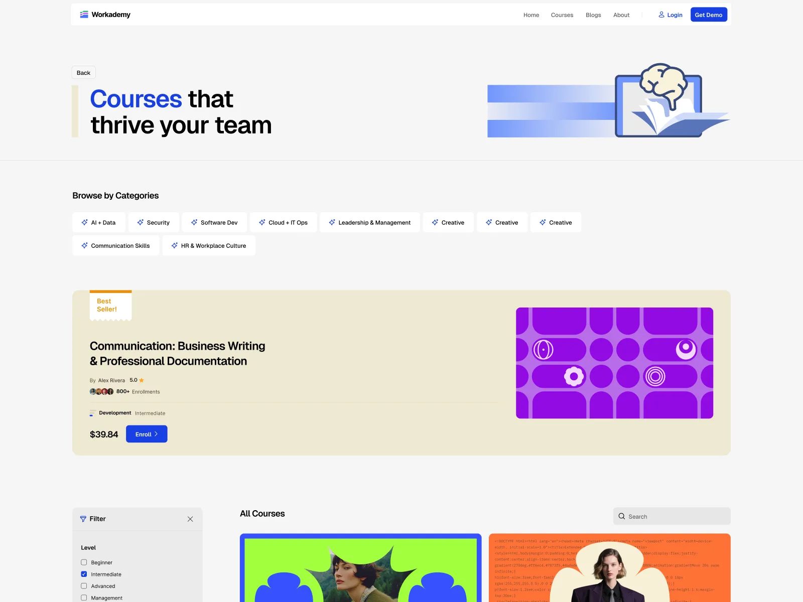 From onboarding new hires to launching advanced certification programs, Workademy provides the professional structure and sleek design needed to engage modern learners. With pre-built pages like Courses, Instructors, Blog, Checkout, etc, your eLearning platform is ready to launch in no time. The theme’s clean layouts and intuitive navigation ensure learners stay focused and engaged throughout the whole course.